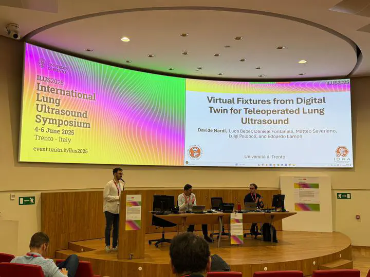 The Medical Robotics team, represented by Davide Nardi and Edoardo Lamon had two talks (plus a third one co-authored) at the 2nd International Lung Ultrasound Symposium 2025 (ILUS), held in Trento. Our work focused on teleoperated lung ultrasound, a growing area of interest at the intersection of robotics and medical imaging that faces novel challenges, both for roboticists and clinicians. As part of the event, we delivered two 15-minute presentation highlighting our methodology based on a novel way of generating virtual fixtures from the generation of a digital twin.